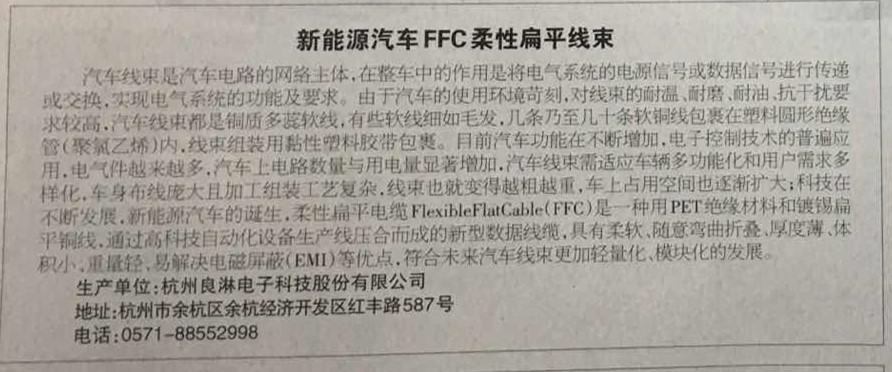2017年7月28日 浙江高新科技產(chǎn)品榜上有名——新能源汽車FFC 柔性扁平線束